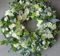 Rouwkrans met witte bloemen en groen. Diameter 50 cm.