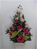 Photo non contractuelle | Pot coloré fleurs tergal Pot coloré, hauteur environ 70 cm, composé de roses fushia, lys, mufliers et fleurs assorties