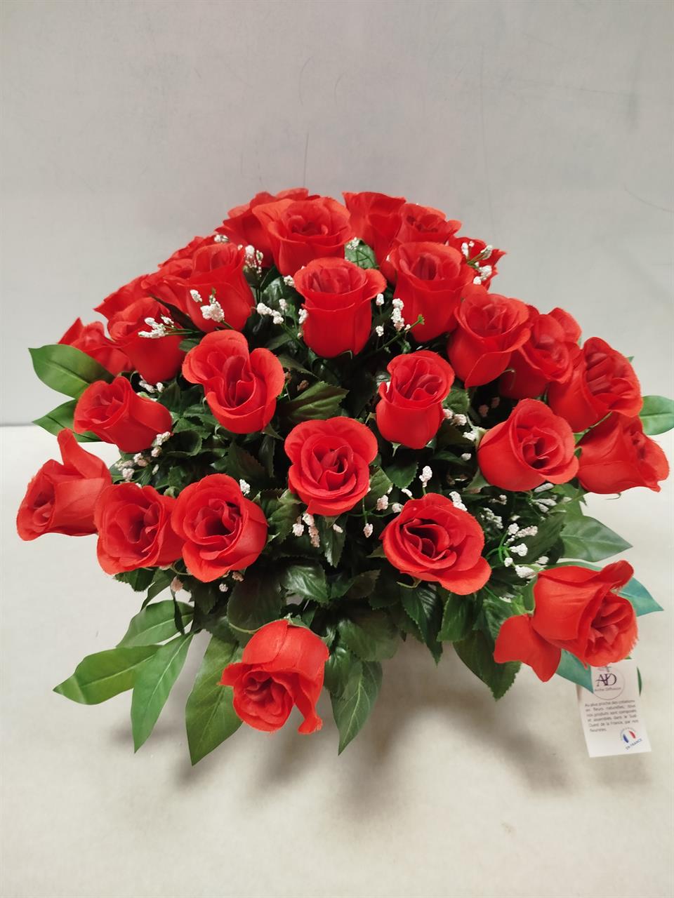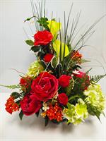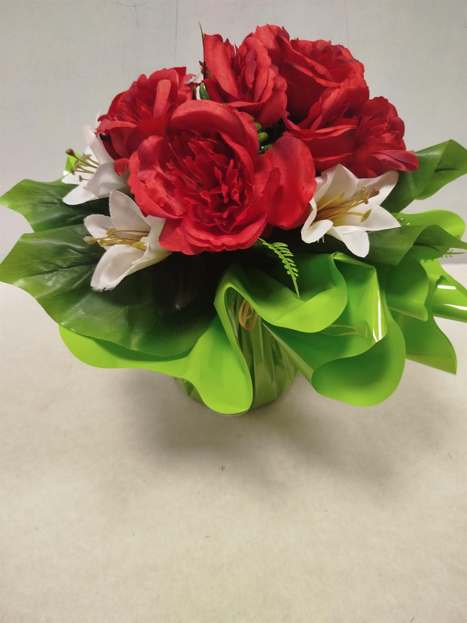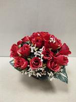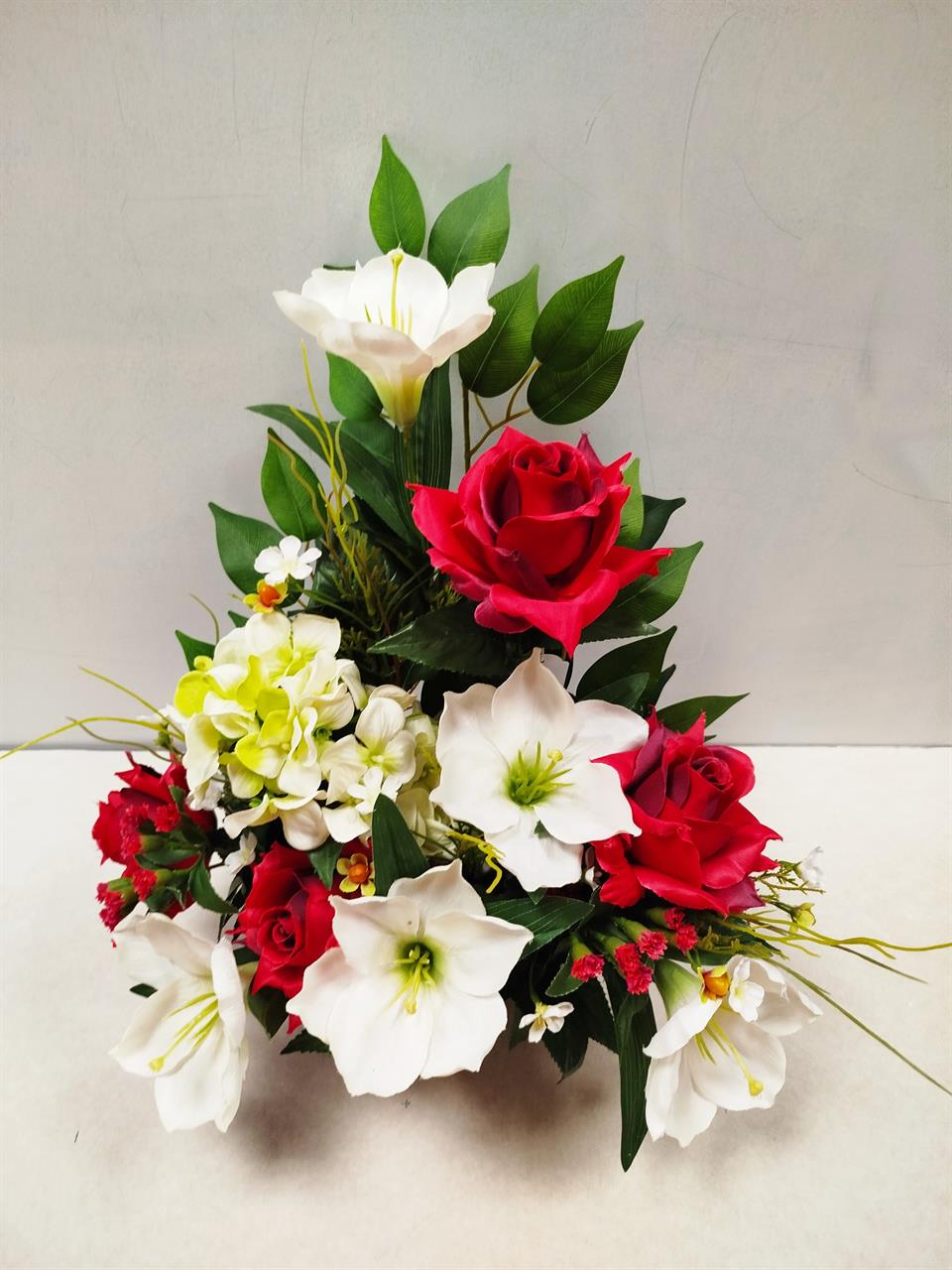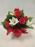 | Bouquet lesté en fleurs artificielles Bouquet lesté mélange de roses rouges et lys blancs.