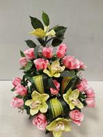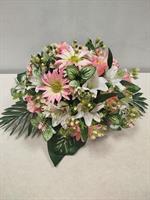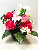 | Potée de fleurs artificielles Potée de fleurs artificielles dans les tons rose. Possibilité de mettre un ruban, le préciser dans la commande.