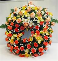 | Couronne en fleurs artificielles Couronne en fleurs artificielles, dans les tons orange et jaune. Possibilité de mettre un ruban, le préciser dans la commande.
